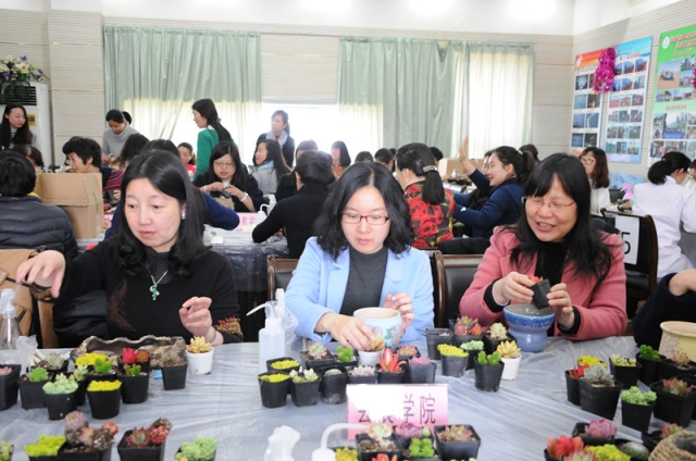 花艺师从多肉植物的特点、类型、护养技巧及实操过程,深入浅出地为必赢626net入口首页女教职工传授插花理论和技巧。之后,花艺师仔细的为教职工们示范多肉植物作品的步骤,让教职工们跟着学做,并耐心的指导教职工们完成了多肉植物作品。校工会、女工委还邀请了钢琴演奏者在活动中伴凑,增添了浓厚的艺术氛围。在花艺师们的指导下,每位女教职工都完成了各自的多肉植物栽培作品。整个活动现场互动气氛热烈,活动取得了预期的良好效果。
