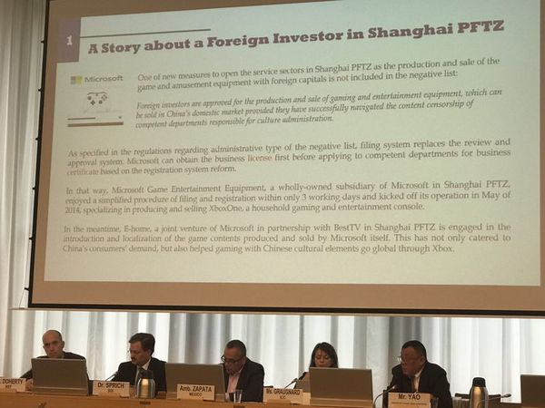 姚为群教授在研讨会“商界视野里的投资便利化需求”专题讨论中作了题为“地方政府如何为满足外国投资者需求推进贸易便利化:上海的实践”的发言,和与会的WTO成员分享了2013年9月以来上海自由贸易试验区对标国际高标准,采用准入前国民待遇加负面清单模式,深化外商投中国资管理体制,推进投资便利化,服务企业的主要做法、成效、案例和启示。专题讨论由墨西哥驻世贸组织大使主持,参加讨论的还有世界经济论坛、德国工业联合会和国际商会的代表。