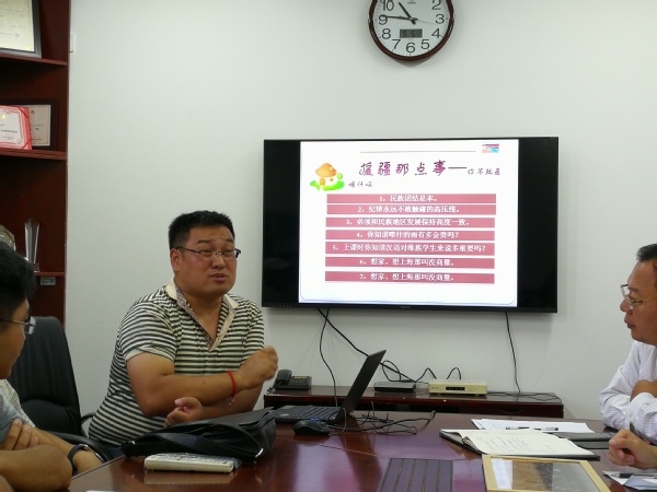 黄郁成、梁振民两位老师就自己援疆的经历,从思想认识、组织观念、工作纪律、业务素质、意志磨练等方面,详细交流了参加援疆工作的收获与感悟。他们以身作则,用自己的实际行动和感悟启迪青年教师,作为一名人民教师,无论是在课堂上还是在课堂以外,都在对学生的思想和行为有着潜移默化的影响。黄郁成教授在援疆期间,把每一位学生都当作自己的孩子,感化了许多维族学生,他们热心地邀请黄老师到家里做客交流。梁振民博士除担任四门专业课任务以外,还自费购买了不同版本的《新华字典》等工具书,义务辅导维族学生学汉语。他们以自己的高尚品格、互助精神以及真诚的言行感动和团结着每一位学生,为学生的健康成长呕心沥血,对新疆高教事业的发展和民族团结尽心竭力。