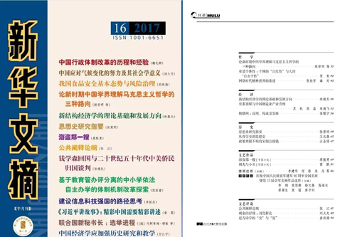 《新华文摘》是人民出版社主办的大型的综合性、学术性、资料性的文摘半月刊。作为大型理论性、综合性、资料性文摘类权威期刊,《新华文摘》广涉千家报刊,精取天下文章,编选了大量弘扬时代主旋律、荟萃人文学术精华、凝聚中国经验的优秀文章,以其思想性、学术性、权威性和可读性享誉海内外,是我国最具影响的哲学社会科学文摘类杂志。