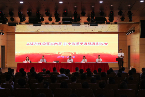 9月12日下午,学校在古北校区综合楼隆重举行2017年教师节庆祝表彰暨审核评估动员大会。校领导殷耀、朱国宏、祁明、陈洁、聂清、徐永林、教师代表、学生代表近400人出席会议。会议由校党委书记殷耀主持。