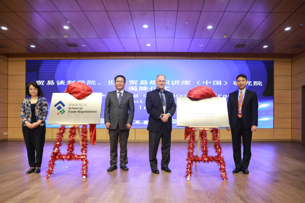 仪式上,朱国宏和尚玉英共同为贸易谈判学院揭牌,易小准和Robert Koopman共同为世界贸易组织讲席(中国)研究院揭牌。