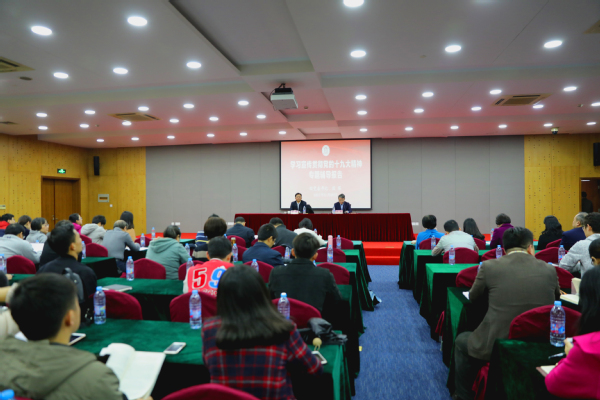 1128日下午,学校党委在信息楼526会议室举办了学习宣传贯彻党的十九大精神宣讲报告会,校党委书记、党的十九大精神宣讲团成员殷耀率先作了题为《不忘初心、牢记使命,用习近平新时代中国特色社会主义思想贯穿育人全过程》专题辅导报告,校领导班子成员、全体中层干部、党支部书记和第二届青年骨干教师培训班学员参加了报告会,报告会由校党委副书记、副校长祁明主持。