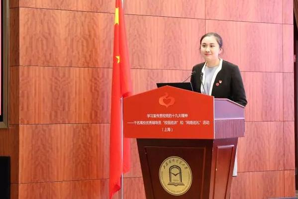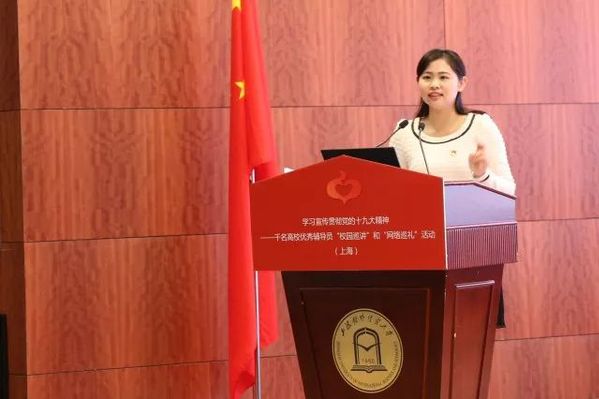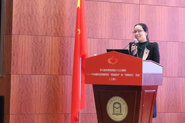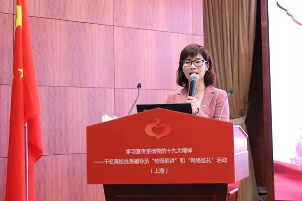 巡讲活动在激昂澎湃的国歌声中拉开序幕。巡讲组5位优秀辅导员依次登台巡讲。他们结合个人学习、工作和成长经历,通过大量的鲜活的人物和事例,从不同角度生动地解读了党的十九大精神,深深地鼓舞了每一名在场师生。2016上海高校辅导员年度人物、上海外国语大学曹姝婧老师巡讲的题目是《我们的时代:中国理念开启崭新征程》;2012年上海高校辅导员职业能力竞赛三等奖获得者、上海理工大学章少哨老师巡讲的题目是《我们的使命,中国力量绘就宏伟蓝图》; 2016年上海市青年五四奖章获得者、上海师范大学金黎琼老师巡讲的题目是《我们的成就:中国智慧展现大国担当》;第六届全国高校辅导员年度人物、2013上海高校辅导员年度人物、同济大学李睿老师巡讲的题目是《我们的坚守:中国精神砥砺伟大梦想》;2014年上海高校辅导员年度人物、上海商学院刘俊老师巡讲的题目是《我们的梦想:中国青年书写人生华章》。