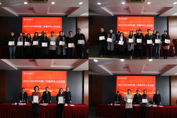 会上颁发了2017年大学生形势与政策课程教学效果奖、2017年征兵工作先进集体和先进个人、第十四届上海高校辅导员论坛征文获奖、2017年上海高校辅导员职业能力大赛获奖、2017年上海高校辅导员年度人物提名奖、2017年度学院学生工作绩效考核优秀单位等荣誉证书。曹瑞雪、虞娅娜、刘素贞三位老师分别就岗前培训体会、辅导员成长感悟、思政研究思考等方面做了交流汇报。党委学工部部长严大龙、校团委副书记缪韵笛分别介绍了2018年学工部、武装部和校团委的工作重点。