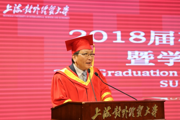 朱国宏校长发表了热情洋溢的讲话。他首先代表学校对毕业生顺利完成学业表示诚挚的祝贺。他说,学校近年来研究生培养质量稳步上升,2018届研究生在重大赛事、学术科研、升学就业等方面取得了优异的成绩。他指出,人才培养始终是大学的核心功能,一所大学的价值,在于其毕业生对社会、对人类作出的贡献,各位毕业生在今后学习和工作道路上要砥砺奋进,勇敢肩负起对国家、社会乃至全人类的责任。最后,朱国宏希望毕业生牢牢抓住历史机遇,在推动国际贸易发展、创新国际贸易形态、制定国际贸易规则、提升国际贸易话语权等方面不懈努力,为国家经贸事业发展贡献自己的力量,在实现中华民族伟大复兴的中国梦的进程中体现自己的人生价值。