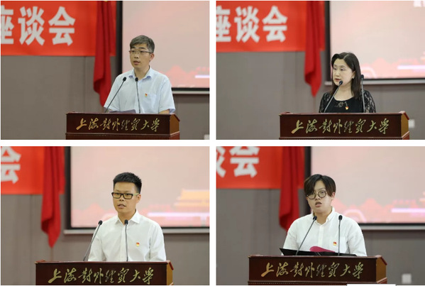 法学院党委书记唐旭生、国际商务外语学院教工党支部书记夏蓓蓓、统计与信息学院党员教师刘亮亮、国际经贸学院党员学生昌薇,分别围绕发挥院系党组织政治核心作用、基层党支部战斗堡垒作用,党员教师和学生的先锋模范作用,作了交流发言。