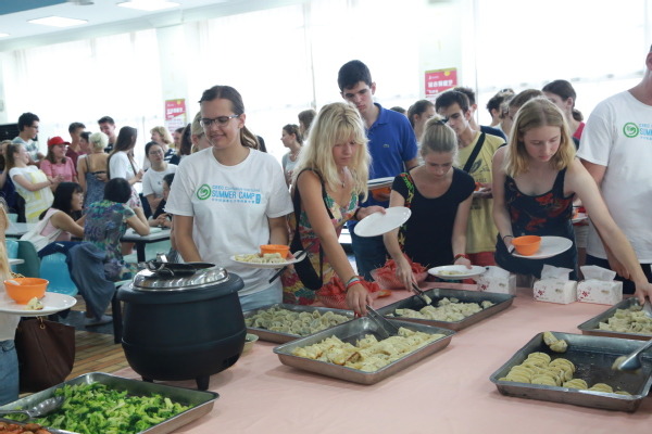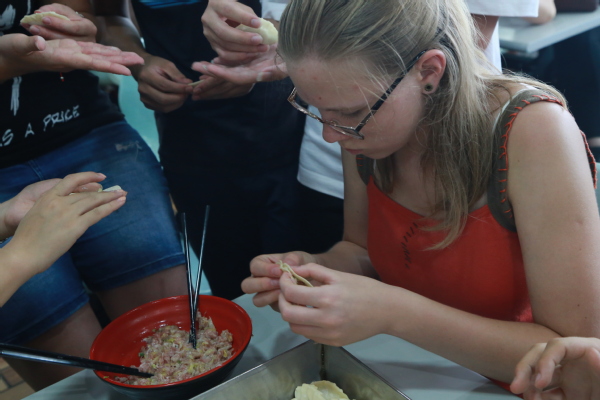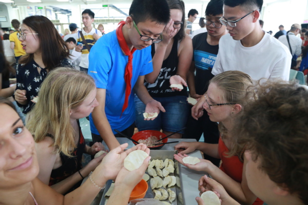 最后,中外师生共赴学校学生食堂体验中国传统文化美食活动。包饺子看似复杂,但丝毫没有抵挡外籍学生的热情,在食堂师傅演示和指导下,中外师生各司其职,中国师生和外籍师生穿插站着和坐着,中国师生教授着友人如何包饺子,外籍学生在新奇和期待后,跃跃欲试动手模仿起来。在欢声笑语中,大家一边包着饺子,一边互相交流。饺子下锅后,捞出来个个似元宝落入盘中,大家互相分享着自己的劳动成果和各种各样的自助晚餐,脸上洋溢着幸福的笑容。
