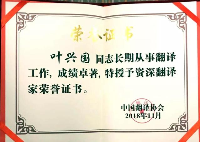 叶兴国教授荣膺中国翻译协会“资深翻译家”称号