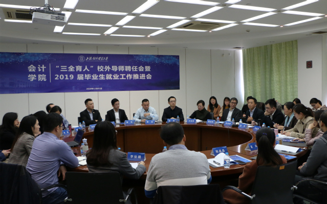 为深入贯彻落实全国思想政治工作会议精神和全国教育大会精神,进一步完善会计人才的培养模式和创新实践平台建设,发挥好校外导师的协同育人作用,构建“三全三圈”的育人同心圆,促进学生的全面发展,12月1日,会计学院隆重举办“三全育人”校外导师聘任会暨2019届毕业生就业工作推进会。会计学院党委书记谈华、院长李婉丽,学生处副处长许永胜,会计学院党委副书记张莉莉、副院长程安林,校外导师以及会计学院师生代表参加了此次会议。会议由张莉莉主持。