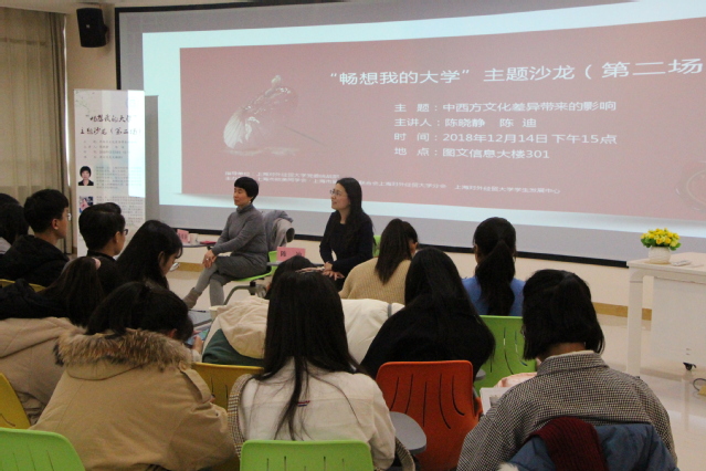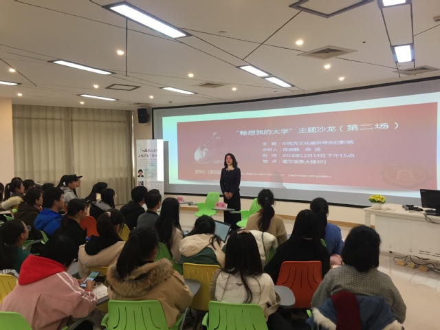 为贯彻落实全国教育大会精神,深入推进必赢626net入口首页全员全过程全方位育人工作,进一步拓展上海市欧美同学会·上海市留学人员联合会必赢626net入口首页分会与学生发展中心合作共建,在校党委统战部与党委学工部共同指导下,12月14日下午在信息楼301研讨室,共建双方举行“畅想我的大学”系列主题沙龙第二场活动,主题为“中西方文化差异带来的影响”。校留联会秘书长阎海燕老师莅临并致辞,校留联会会员、校美国研究中心主任、金融管理学院陈晓静教授和实验教学中心陈迪老师担任本次沙龙主讲嘉宾,新生训练营51名同学参加了活动。沙龙由学工部江昊老师主持。