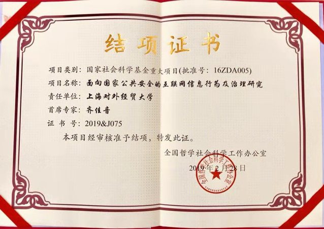 由齐佳音教授主持的国家社科重大项目“面向国家公共安全的互联网信息行为及治理研究”( 16ZDA055),以“免于评审”的方式,日前圆满结题。