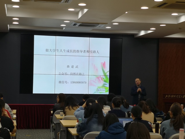 曲建武教授以《做大学生人生成长的指导者与引路人》为主题,结合自身从教多年的经历,用一个个生动、鲜活的案例深入浅出地阐述了作为一名教育工作者如何践行“立德树人”的要求。他以教育的视角、文化的维度,对教育“培养什么样的人、如何培养人、为谁培养人”的问题作了讲解,指出作为一名思政工作教师要帮助学生树立正确的价值观、人生观、世界观,通过言传身教,让学生感受到爱与尊重,成为学生的良师益友。他希望在座辅导员能引导学生践行“爱国、励志、求真、力行”的要求,乘新时代春风,在祖国的万里长空放飞青春梦想。他的讲座得到了在场老师的共鸣,讲座现场掌声雷动。