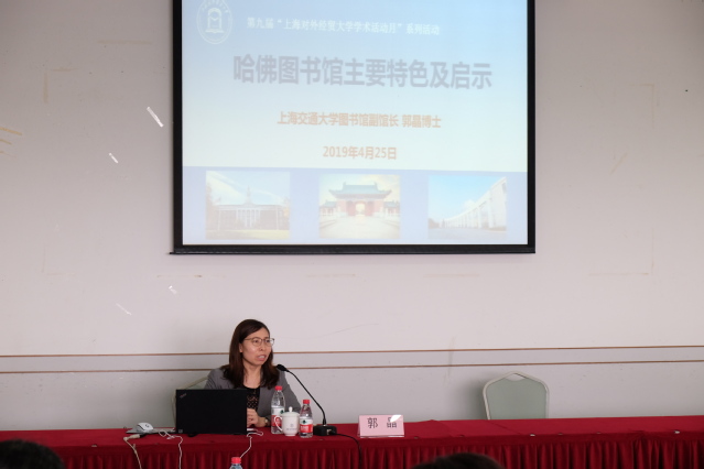4月25日,作为第九届学术活动月活动之一,图书馆邀请上海交通大学图书馆副馆长、研究馆员郭晶博士作了题为“哈佛图书馆主要特色及启示”的讲座。本场讲座由侯占奎副馆长主持,图书馆30多名馆员聆听了讲座。