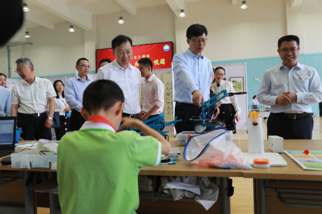 校领导一行首先来到在体育馆设立的静态展示区,饶有兴趣地观看学生自己亲手设计制作的各种各样作品。他们仔细欣赏了学生的书法作品、沥粉画、布艺等作品后,在虚拟机器人领域驻足留步,当看到学生发明创造的“自动垃圾分类器”时,纷纷表示这个创意时尚新颖。特别是听到学生们在课余时间自己编写程序、组建机器人,并且在上海市比赛中获得各项奖项后,纷纷都交口称赞,也对附校开展的各项特色拓展课程给予了充分的肯定。随后,大家来到思源剧场,欣赏“庆祝新中国成立七十周年 博雅教育·蜕变在校园 ——上经贸大附校主题展示活动”。