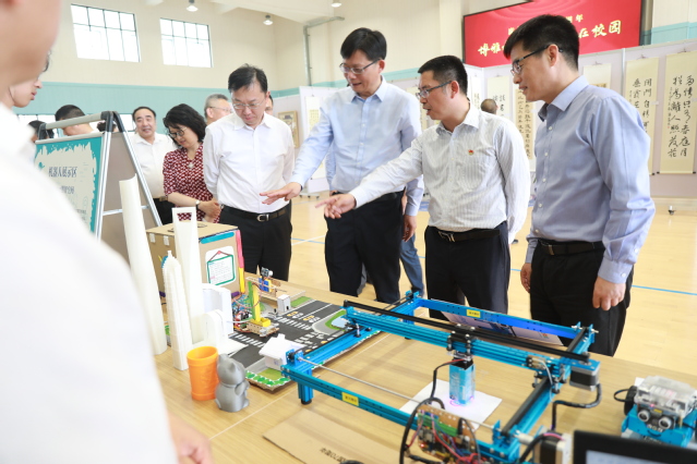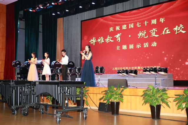 校领导一行首先来到在体育馆设立的静态展示区,饶有兴趣地观看学生自己亲手设计制作的各种各样作品。他们仔细欣赏了学生的书法作品、沥粉画、布艺等作品后,在虚拟机器人领域驻足留步,当看到学生发明创造的“自动垃圾分类器”时,纷纷表示这个创意时尚新颖。特别是听到学生们在课余时间自己编写程序、组建机器人,并且在上海市比赛中获得各项奖项后,纷纷都交口称赞,也对附校开展的各项特色拓展课程给予了充分的肯定。随后,大家来到思源剧场,欣赏“庆祝新中国成立七十周年 博雅教育·蜕变在校园 ——上经贸大附校主题展示活动”。