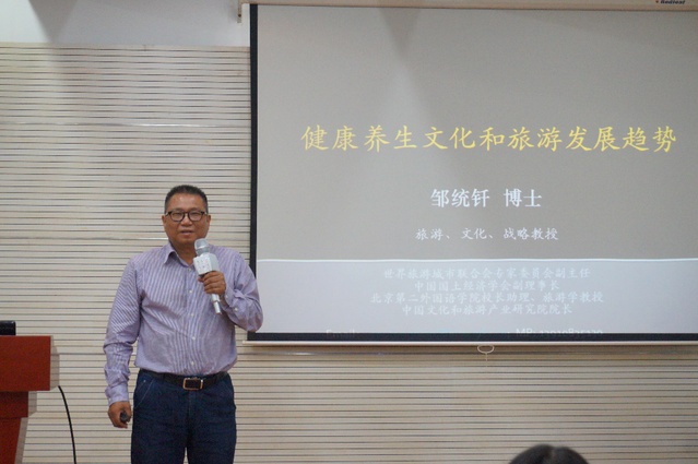 6月13日下午,会展与旅游学院特邀北京第二外国语学院校长助理邹统钎教授开展题为《健康养生文化和旅游发展趋势》的学术讲座。副校长张道方出席讲座并致辞,60多名师生聆听了讲座,讲座由会展与旅游学院副院长刘少湃主持。