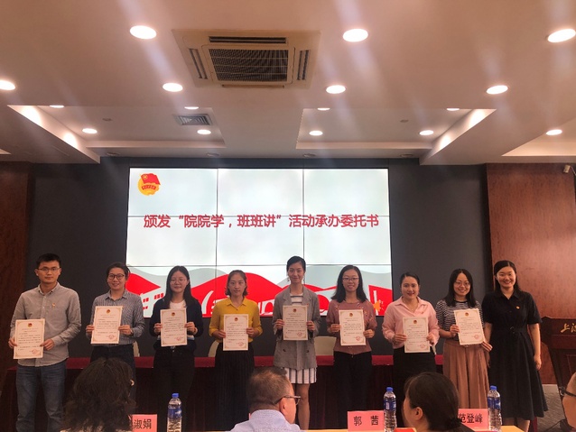 缪韵笛介绍了“青年大学习”主题巡讲活动以及“院院学,班班讲”的学习制度,并为承办“青年大学习”主题巡讲活动的各学院团组织颁发承办委托书。她讲到,“青年大学习讲师团”是由专兼职团干部组成的青年讲师团,将围绕习近平新时代中国特色社会主义思想、团史团情务等主题到各学院团组织、基层团支部开展宣讲活动,通过通过“院院学”促进“青年大学习”常态化,加强理论学习的引领力和联动性,通过“班班讲”推动“青年讲师团”专业化,加强理论学习的辐射力和覆盖面,最终带领广大团员青年做到学思用贯通、知信行合一。