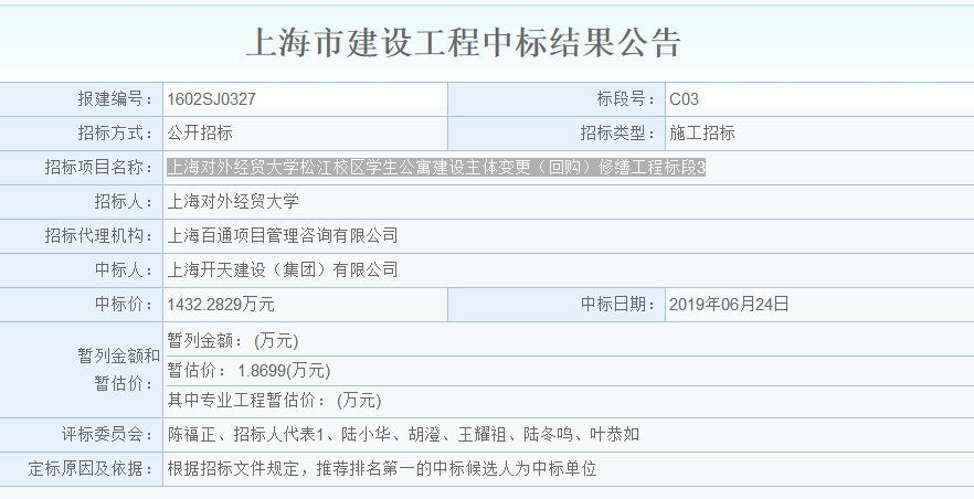 必赢626net入口首页松江校区学生公寓建设主体变更(回购)修缮工程标段3中标结果公示