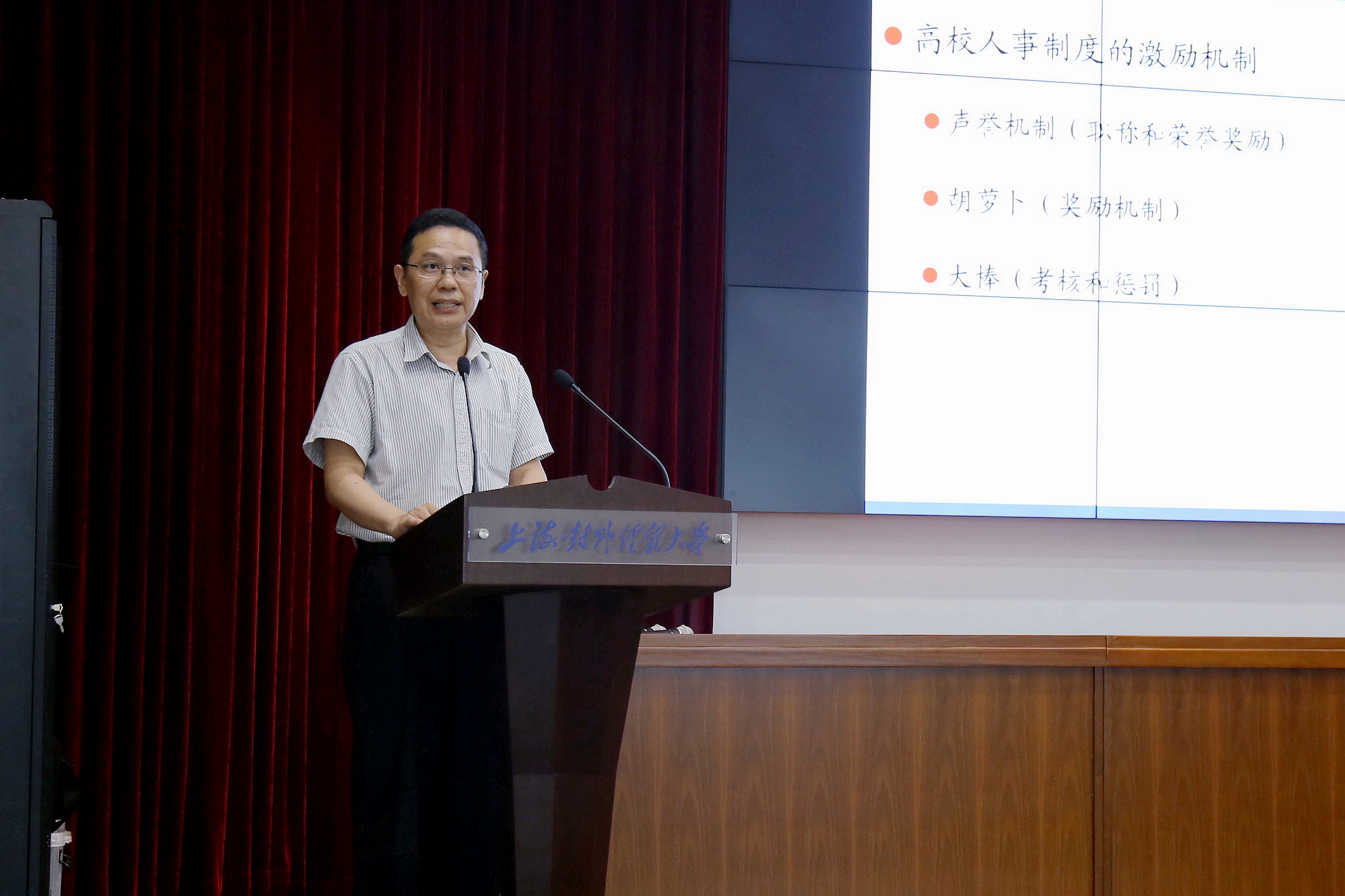 会上,校长汪荣明首先介绍了召开本次会议的背景。他指出,学校要深化改革、加快发展,就要进一步完善学校治理体系,建立具有中国特色和学校特点的现代大学制度。人才问题和人事分配制度是治理体系的重要方面,要通过人事分配制度改革发挥人的核心作用,以教师为主体,铺设教师成长的台阶,激发广大老师和管理队伍的动力。目前,学校已全面展开了人事制度改革的准备工作,人事部门前期做了大量的工作,听取了许多单位、部门领导干部和教师的意见,借鉴了其他兄弟高校的成功经验和做法,起草了相关制度和方案。暑假期间,学校党委多次召开专题会议,就教职工重点关注的人事制度改革的文件和方案进行了深入研讨。