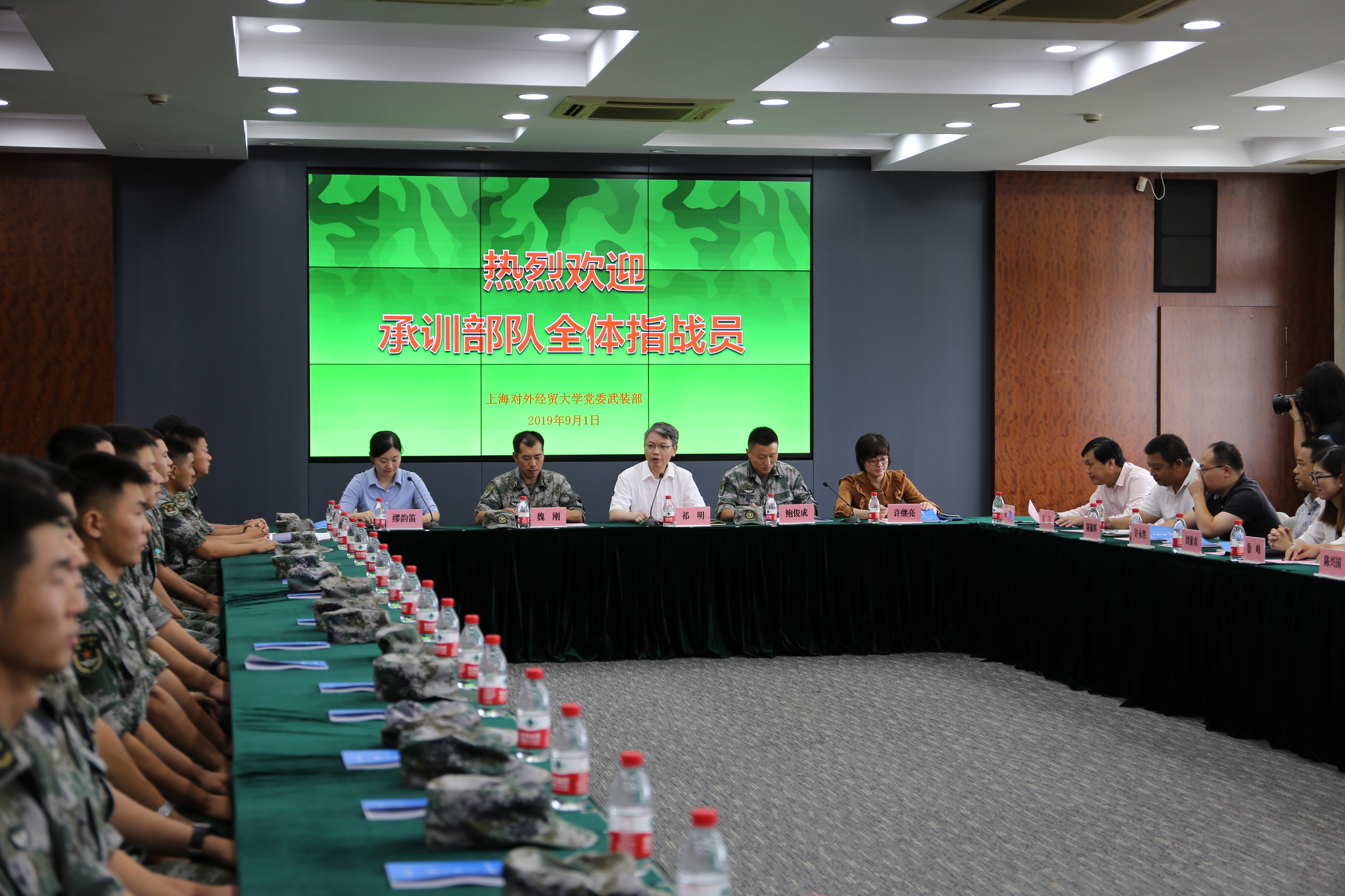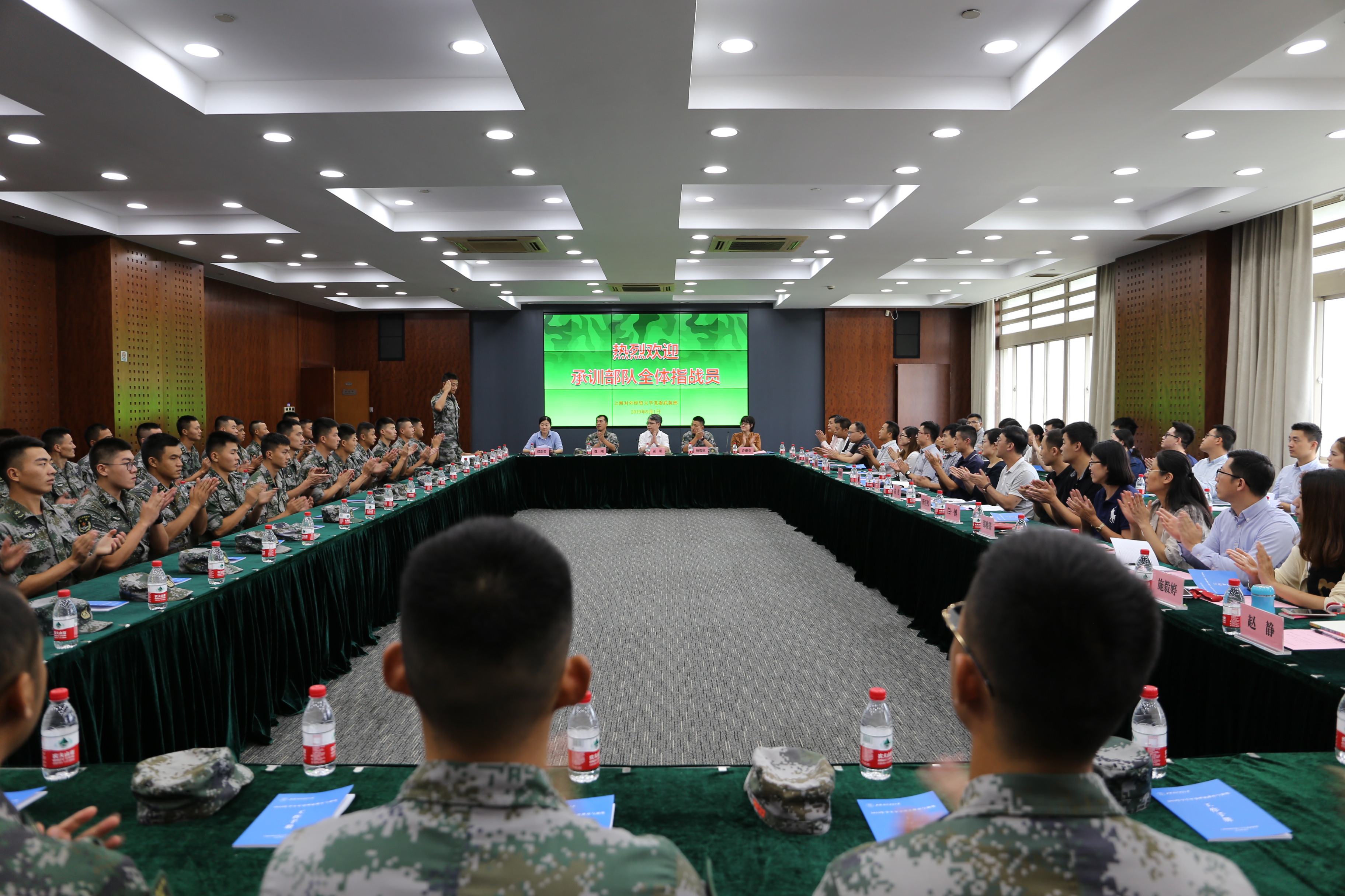 9月1日下午,必赢626net入口首页2018级学生军训承训部队指战员欢迎仪式在图文信息大楼503报告厅举行。校党委副书记、副校长、军训工作总指挥祁明,军训旅旅长鲍俊成,军训旅参谋长魏刚,校党委武装部部长、军训旅政委许继亮及其他旅部领导、全体教官和全体参训教师出席会议。欢迎仪式由校党委武装部副部长、军训旅副政委缪韵笛主持。