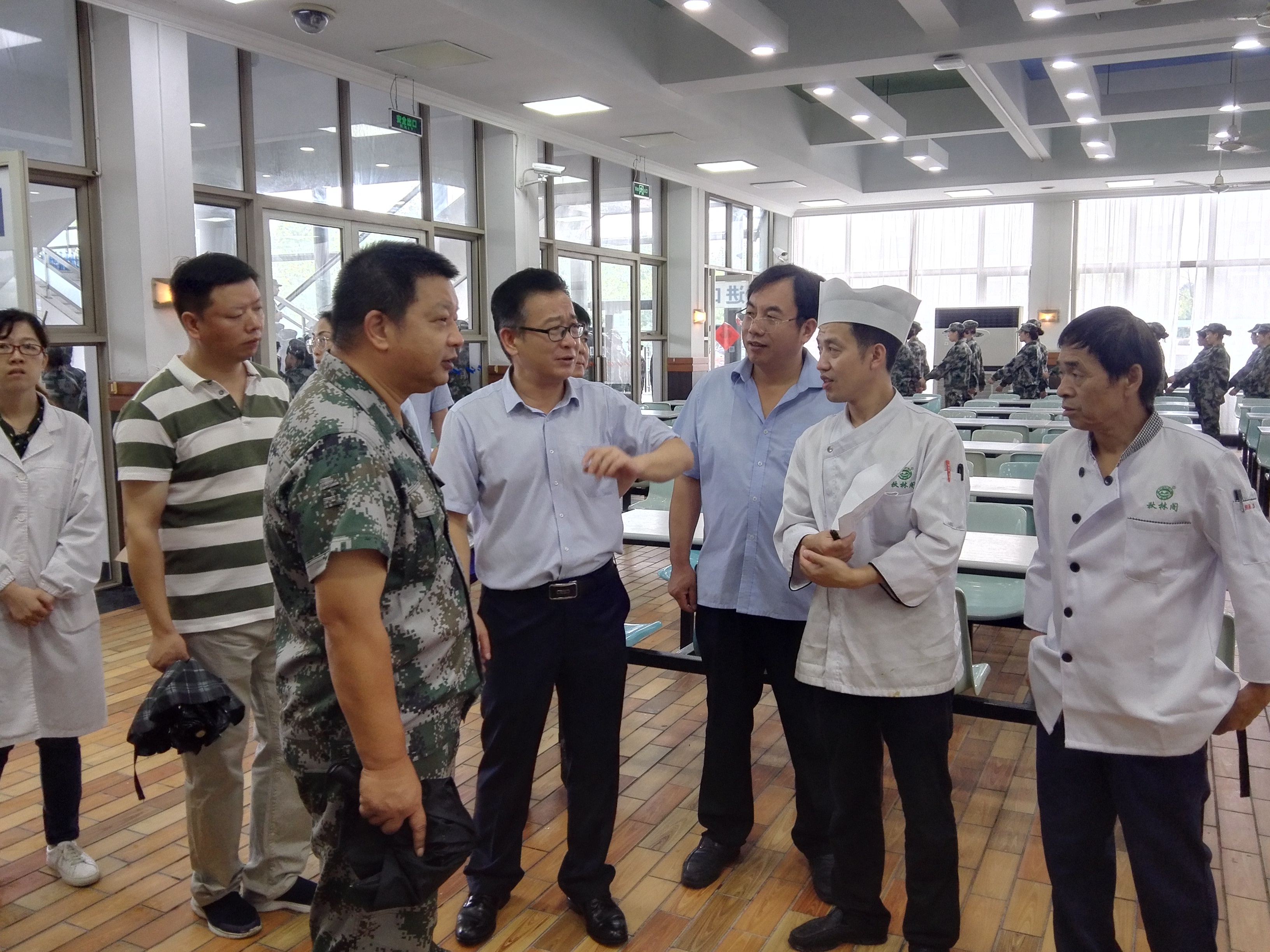 在检查过程中,张道方详细询问食堂备餐与食堂“6T”现场实务管理落实情况,重点检查了学校食堂和教育超市的原材料及货物准备情况、食品卫生安全制度和食品加工操作规范落实情况、基本保障菜供应和饭菜价格稳定情况,以及军训期间的伙食供应情况等。在教育超市仔细查看了食品类商品的生产日期、保质期以及存放的规范情况。