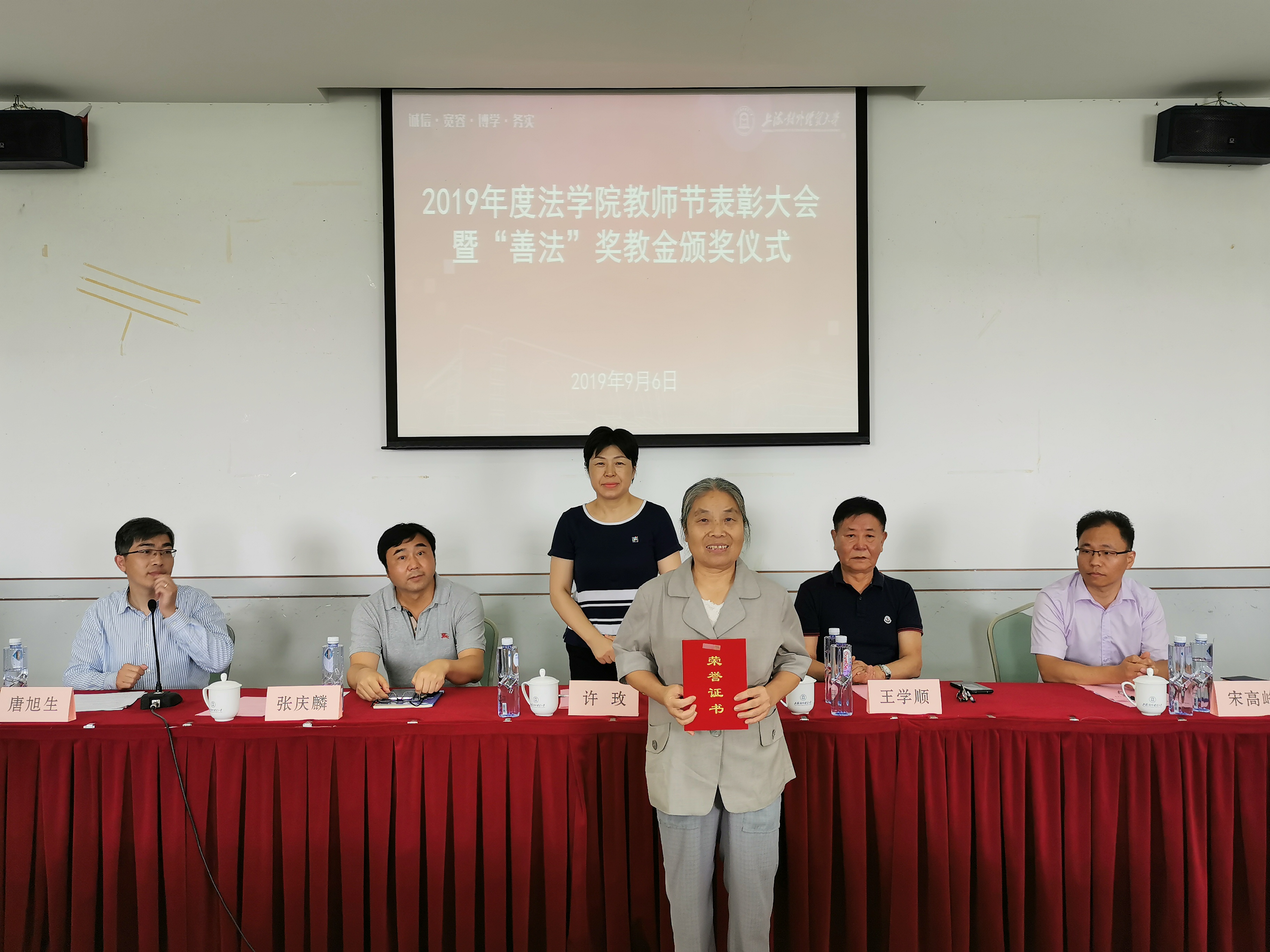 9月6日下午,在第35个教师节来临之际,法学院党委举行教师节表彰会暨“善法”奖教金颁奖仪式。会议对2018-2019年度表现突出的优秀党委工作者、优秀党员和优秀党支部等个人、集体进行表彰,并对获得首期”善法“奖教金的教师进行颁奖。校党委副书记、纪委书记许玫出席活动并致辞。上海善法律师事务所党支部书记王学顺和副书记宋高峰受邀参加表彰大会,法学院全体教职工以及关工委老同志代表、学生党员代表参加会议。表彰大会由法学院党委书记唐旭生主持。