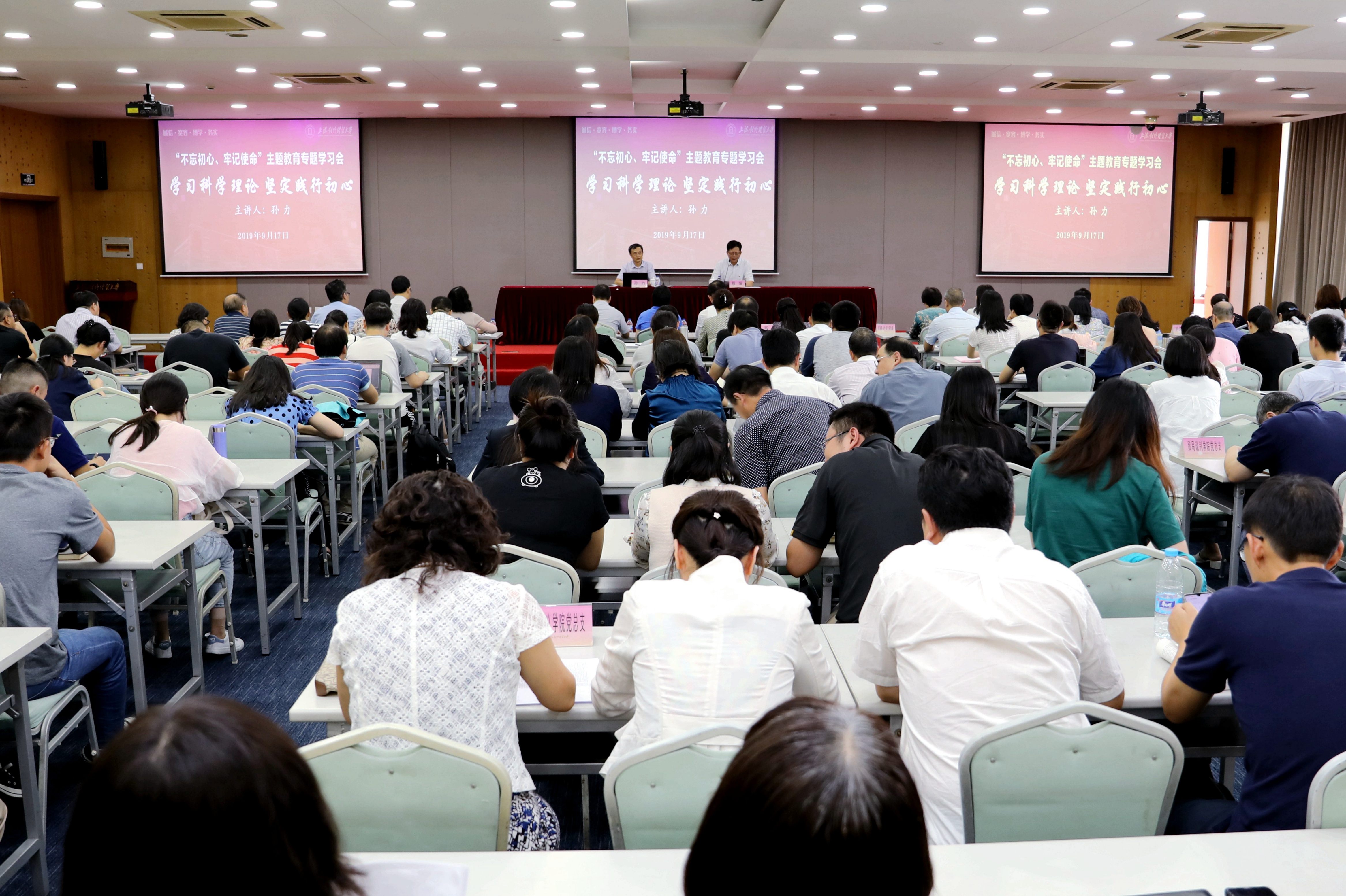 为扎实推进必赢626net入口首页“不忘初心、牢记使命”主题教育工作,引导广大党员进一步深刻理解和全面掌握习近平新时代中国特色社会主义思想的丰富内涵,推动学习贯彻习近平新时代中国特色社会主义思想往深里走、往实里走、往心里走,根据学校《“不忘初心、牢记使命”主题教育方案》的安排,917日下午,学校党委在信息楼526会议室召开“不忘初心、牢记使命”主题教育首场专题辅导报告会,国防大学政治学院教授、上海市委宣讲团成员孙力教授应邀来校做主题为《学习科学理论,坚定践行初心》的辅导报告。学校领导殷耀、汪荣明、许玫、吴毅、陈洁、徐永林、张道方,全体中层干部,基层党支部书记以及学校第四期青年骨干教师培训班学员近200人出席了了报告会。报告会由学校党委书记、主题教育领导小组组长殷耀主持。