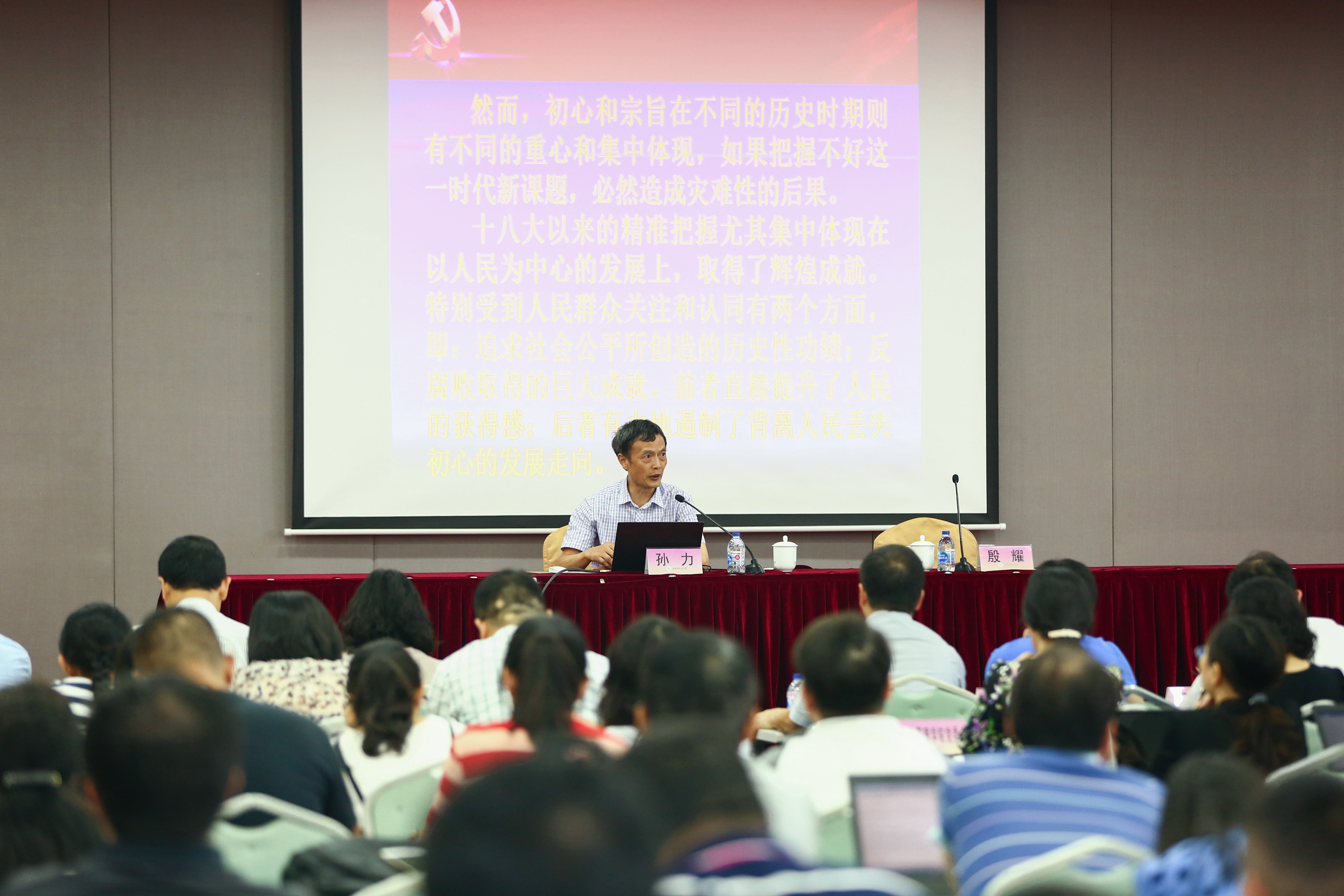 为扎实推进必赢626net入口首页“不忘初心、牢记使命”主题教育工作,引导广大党员进一步深刻理解和全面掌握习近平新时代中国特色社会主义思想的丰富内涵,推动学习贯彻习近平新时代中国特色社会主义思想往深里走、往实里走、往心里走,根据学校《“不忘初心、牢记使命”主题教育方案》的安排,9月17日下午,学校党委在信息楼526会议室召开“不忘初心、牢记使命”主题教育首场专题辅导报告会,国防大学政治学院教授、上海市委宣讲团成员孙力教授应邀来校做主题为《学习科学理论,坚定践行初心》的辅导报告。学校领导殷耀、汪荣明、许玫、吴毅、陈洁、徐永林、张道方,全体中层干部,基层党支部书记以及学校第四期青年骨干教师培训班学员近200人出席了了报告会。报告会由学校党委书记、主题教育领导小组组长殷耀主持。