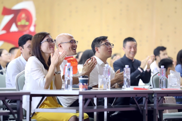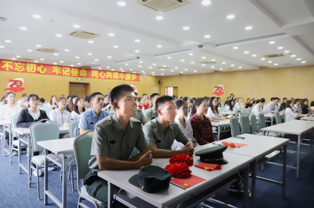 校领导为响应国家号召应征入伍奉献青春的2019年退伍学生进行表彰并授予荣誉胸花。来自校大学生艺术团语言艺术团的同学朗诵了诗歌《闪耀吧,青春的火光》。暑期社会实践带队教师代表、金融管理学院朱晋赤,连续两次参加进博会志愿服务的学生代表、国际商务外语学院施玮懿,退伍学生代表、统计与信息学院来一聪分别作了主题演讲,讲述了他们以不同的方式把青春献给祖国的感人事迹。最后,全场师生共同唱响《我和我的祖国》,表达了对祖国深厚的情感。现场巨幅五星红旗在师生间相互传递,共同凝聚起为祖国发展做贡献的强大力量。