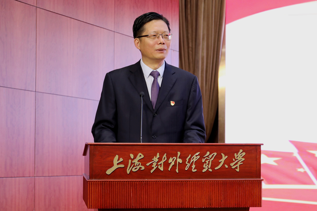 校党委书记殷耀讲话。他指出,庆祝新中国成立70周年主题活动,既是引导广大党员铭记历史、追寻初心的重要形式,也是对青年大学生们进行的一次爱党爱国教育;既是向历史致敬,更是向未来奋进。他强调,要始终坚定理想信念,在坚守初心中成就伟业;要不断强化使命担当,在不懈奋斗中实现梦想。他希望学校各级党组织和全体党员、干部都能以“不忘初心、牢记使命”主题教育为重要契机,深入学习贯彻习近平新时代中国特色社会主义思想,切实增强“四个意识”、不断坚定“四个自信”、坚决做到“两个维护”,以坚定的理想信念坚守初心、滋养初心、践行初心,切实担负起为党育人、为国育才的神圣使命,为国家培养更多优秀的高层次、应用型、国际经贸人才,更好地服务上海“五个中心”“四大品牌”建设和三项新的重大任务,以学校事业发展的新进步、新成绩为祖国献礼。