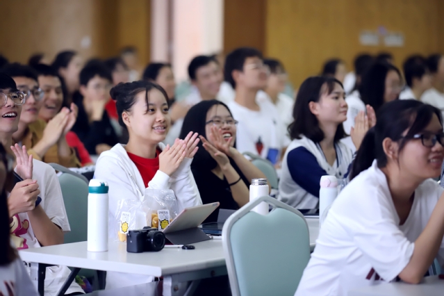 校领导为响应国家号召应征入伍奉献青春的2019年退伍学生进行表彰并授予荣誉胸花。来自校大学生艺术团语言艺术团的同学朗诵了诗歌《闪耀吧,青春的火光》。暑期社会实践带队教师代表、金融管理学院朱晋赤,连续两次参加进博会志愿服务的学生代表、国际商务外语学院施玮懿,退伍学生代表、统计与信息学院来一聪分别作了主题演讲,讲述了他们以不同的方式把青春献给祖国的感人事迹。最后,全场师生共同唱响《我和我的祖国》,表达了对祖国深厚的情感。现场巨幅五星红旗在师生间相互传递,共同凝聚起为祖国发展做贡献的强大力量。