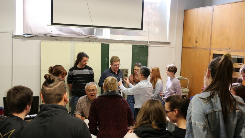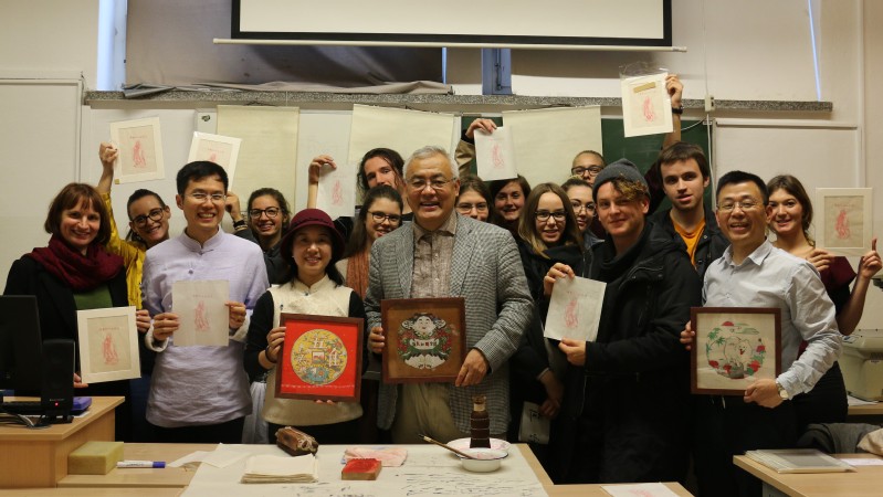 下午,周斌教授与桃花坞木刻年画的两位老师赶赴卢布尔雅那大学文学院课堂。课上,周教授以轻松幽默的语言、用真实生动的例子向学生讲授了中国书法能益智促健康的独特魅力。
