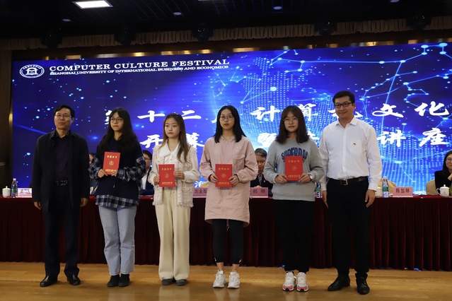 开幕式上,刘永辉宣读了2019年中国计算机设计大赛和2019年上海市计算机应用能力大赛的获奖名单。与会嘉宾领导分别为获奖队伍颁奖。组委会主任徐家利同学对本届计算机文化节的各类活动安排、创新点及竞赛评审细则作了介绍。2019年全国计算机设计大赛二等奖、2019年上海市计算机应用能力大赛二等奖得主吴烜圣同学在会上分享参赛体会并展示其作品。