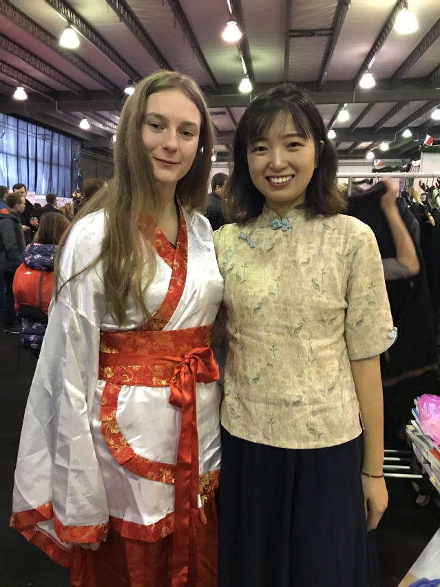 穿上汉服的朋友与孔院教师合影