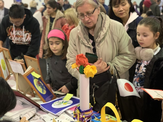 义卖现场气氛热烈,人头攒动,歌舞阵阵。中国使馆的展台位于现场中心位置,在鲜艳的五星红旗、喜庆的大红灯笼和充满中国元素背景板的映衬下格外醒目。来到中国使馆展台,首先映入眼帘的就是萨大孔院教师们的现场书法表演、手工制作展示和各种自制的义卖品。许尔文大使在义卖期间来到孔院义卖台前,与参加活动的教师亲切交谈,为我们精心准备的义卖品点赞。