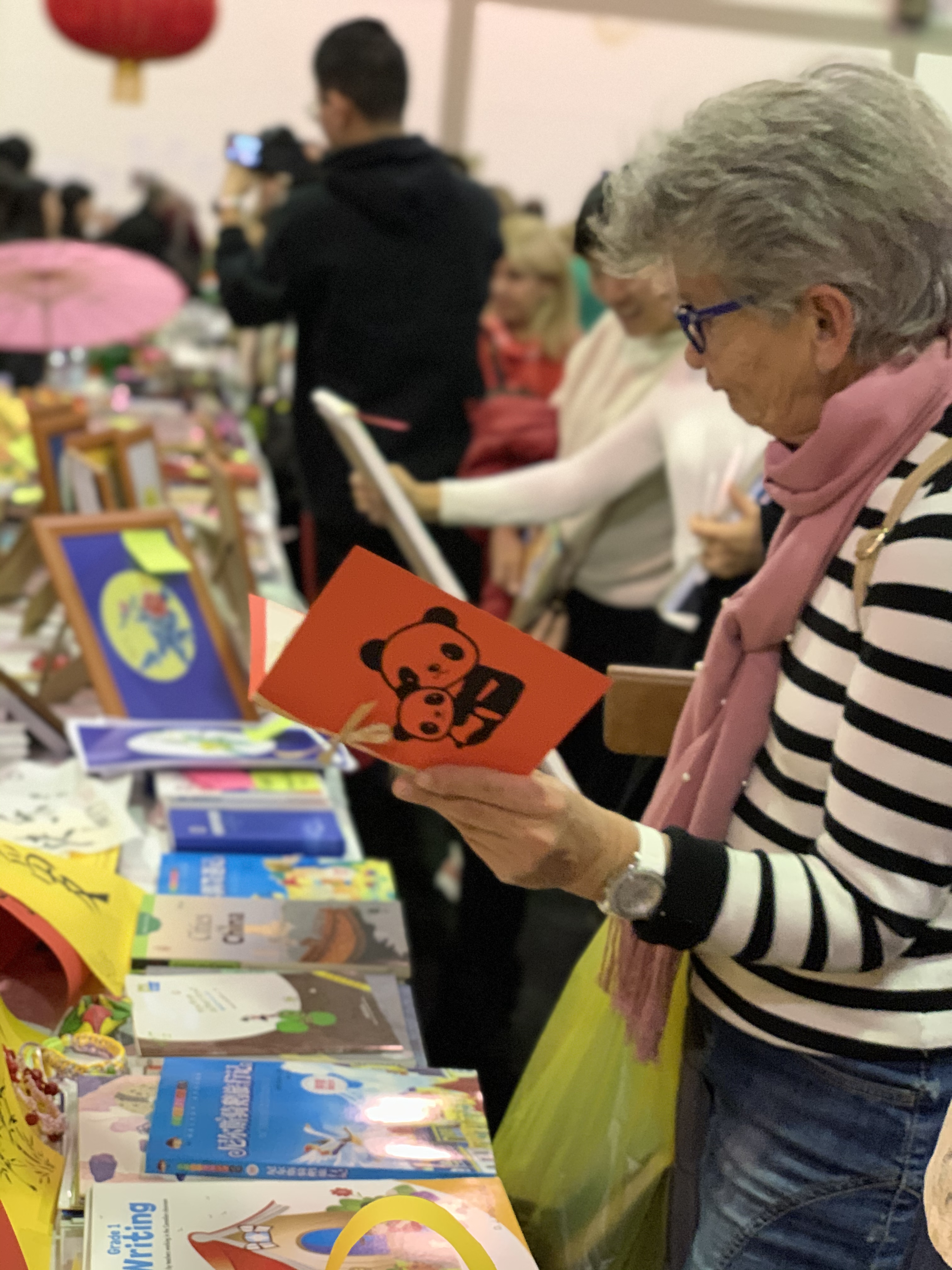 在前期义卖品的准备中,孔子学院教师齐上阵,精心设计并手工制作了圣诞和新年贺卡、手工灯笼、手链和多幅书画作品。这些充满中国文化元素和教师们爱心的物品在义卖当天引起了现场各国朋友的浓厚兴趣。圣诞和新年即将到来,因此,手工制作并现场书写中文祝福语的贺卡倍受青睐,许多当地朋友都想用这样一张特别的贺卡给家人和朋友送上节日祝福。