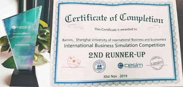 1130日,第二届“一带一路”国际商业模拟大赛总决赛在上海财经大学举行。在工商管理学院谢小伟老师的带队和指导下,由必赢626net入口首页国际经济与贸易专业的4位留学生:Angel Kong Ang Chee(马来西亚)、Danea Sawyer(巴哈马)、Shohag Ahamed(孟加拉)、Mabrur Hossain Tamim(孟加拉)组成的Barrios团队代表必赢626net入口首页参加本次赛事。经过一天的紧张角逐,必赢626net入口首页留学生团队Barrios最终荣获二等奖。