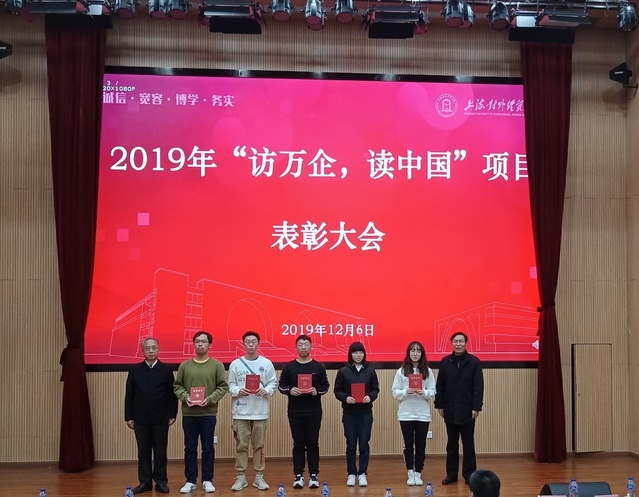 12月6日下午,学校2019年“访万企,读中国”项目表彰大会在思源报告厅401举行。中国对外经济贸易统计学会会长刘贻南、环球慧思信息技术有限公司总裁邵宏华、统计与信息学院院长刘永辉、校党委宣传部部长严大龙、教务处处长龙江、科研处副处长赵蕾、党委学工部副部长刘素贞,校团委书记缪韵笛、校友会秘书处副处长晏琼、统计与信息学院党委副书记韦玉娟、副院长刘慧、郝程程、王利娟以及参与项目的全体师生参加表彰大会。