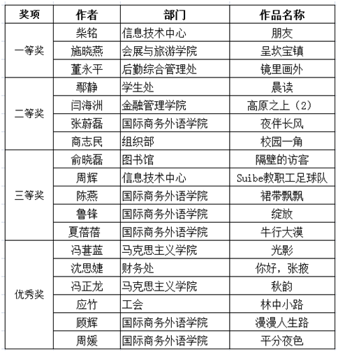 本次活动为摄影爱好者提供了一个摄影作品欣赏、摄影技术切磋、相互交流的平台。活动共收到摄影作品68幅,作品题材广泛、内容丰富、主题突出。校工会成立了专家评审小组,本着公平、公正、公开的原则,对所有作品进行了分类和匿名编号。经过评委们认真仔细评选,深入讨论后,评选出一等奖3名,二等奖4名,三等奖5名,优秀奖6名。获奖作品通过独特的视角,发现美,展现美,讲述了一幅幅五彩光影的故事,展现了广大教职工热爱生活、积极向上的精神风貌。