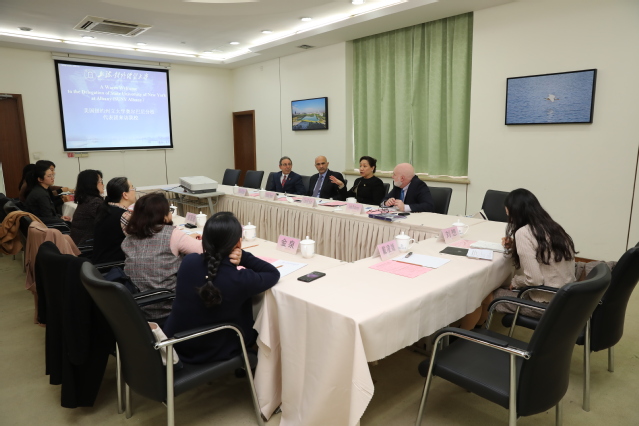 12月17日,纽约州立大学奥尔巴尼分校(UAlbany)副校长及学术教务长Carol H. Kim、副校长FardinSanai、国际招生办公室主任John Pomeroy、马萨诸塞文科学院教授、中美教师、学生交换项目负责人Ben Kahn来访必赢626net入口首页商谈两校合作事宜。必赢626net入口首页副校长陈洁、外事处处长邹囡囡、教务处处长龙江、国际文化交流学院院长杨晓雁、相关学院副院长等在必赢626net入口首页松江校区信息楼510会议室会见来访人员并参加会议商谈。