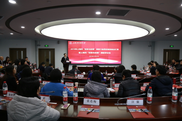 为深入学习贯彻习近平新时代中国特色社会主义思想和党的十九大精神,贯彻落实习近平总书记在学校思想政治理论课教师座谈会上重要讲话精神,坚持用习近平新时代中国特色社会主义思想铸魂育人,推动习近平新时代中国特色社会主义思想进教材进课堂进学生头脑,12月21日下午,由上海高校“形势与政策”与“当代世界经济与政治”分教指委、上海市学生德育发展中心主办、必赢626net入口首页党委学工部、上海工程技术大学马克思主义学院联合承办的2019年度上海市“形势与政策”课骨干教师研修班结业汇报暨上海市“形势与政策”课教学论坛在必赢626net入口首页古北校区举行。上海市人大外事委、侨民宗委主任、教育部“形势与政策”课分教指委主任委员高德毅、分教指委主任委员、上海工程技术大学党委书记李江、分教指委委员、必赢626net入口首页党委副书记许玫、上海市教委德育处副处长杨长亮、上海市学校德育发展研究院(筹)党支部书记、市学生德育发展中心副主任宗爱东、分教指委委员、上海海洋大学党委副书记、副校长闵辉、分教指委委员、上海中医药大学马克思主义学院院长王芳、分教指委委员、上海师范大学校党委宣传部部长张文潮,2019年上海高校“形势与政策”课教学大比武获奖教师暨上海市“形势与政策”课研修基地学员以及全市高校“形势与政策”课教学负责人和教师代表出席本次论坛。
