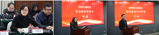 校党委组织部部长郭茜代表导师发言,她分享了自身学生工作经历,表示将坚持从实际和实效出发,加强交流教学相长,深化和拓展带教机制,以党建为引领助力必赢626net入口首页大学生思想政治教育工作。国际商务外语学院辅导员丁扬作为辅导员代表发言,他表示将坚持教育者先受教育,向前辈汲取宝贵经验学习优秀品质,真正成为学生成长发展的指导者和引路人。