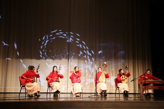 在两所学校访问期间,必赢626net入口首页大学生艺术团民乐团的六名学生(张琳琳、刘清兮、宋益青、张旻晗、於梓翰、李致瑶)用古筝、阮、笛子、柳琴、二胡、琵琶、梆子等中国传统乐器呈现了精彩的民乐演出,曲目包括《彩云追月》《烟雨江南》《春到沂河》《春到湘江》《茉莉芬芳》《彝族舞曲》《月夜》《赛马新编》等中国经典民乐,获得了观众的热烈掌声。民乐团的学生向当地学生介绍了中国民族乐器的相关知识和演奏方法,并开展了乐器体验和交流互动。