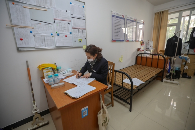 物业工作人员是疫情防控期间学生社区最辛苦的人。为切实做好学生身体思想状况跟踪调查,社区建立了24小时值班值守制度,工作人员每日巡检宿舍楼,为寒假留校生测量两次体温,对公共区域进行两次消毒,做好学生出入口登记、测温和社区巡逻工作。薛勤芳是社区物业一名普通的工作人员,作为一名党员和临时党支部成员,春节期间她没有休息一天,始终坚守工作岗位,做好学生体温测量、统计学生信息等各项工作。为确切掌握留校学生住宿情况,经常加班到深夜11点以后。