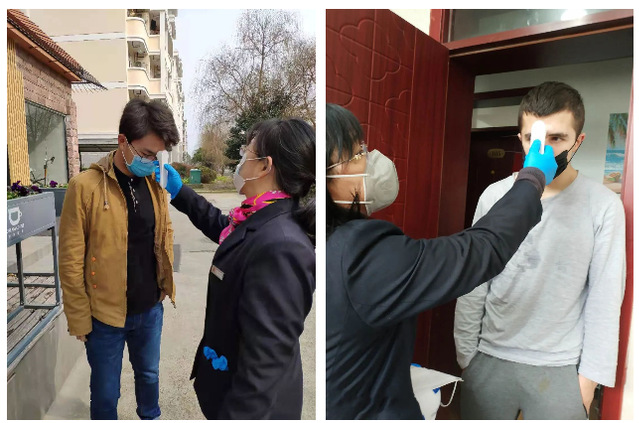 9:00  物业工作人员开始晨检,为学生测量体温。