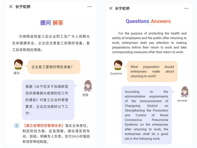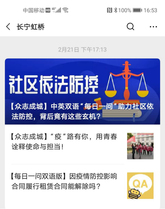 李磊老师欣然接受这项工作,和研究生董岭晓一起开展了翻译工作。在翻译的过程中,李磊老师还从专业角度审核相关内容是否符合法律法规,对一些错误和模糊的地方进行了修正。目前,李磊和董岭晓翻译的宣传资料已在“长宁虹桥”微信公众号上连载了13期,小区出入管理规定、如何配合社区开展工作以及合同解除、工资计算等问题都用双语进行了专业的解答,这一做法日前被“学习强国”进行了报道。李磊老师表示,能利用自身专业知识,为社区疫情防控宣传和法律咨询做出贡献,自己也感到光荣。在疫情防控期间,他将继续完成好这一项工作,在疫情期间为虹桥街道做好法律宣传和咨询工作。