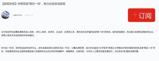 除了在媒体上发表学术文章,必赢626net入口首页专家以实际行动为社区防疫贡献智慧力量也受到媒体关注,“学习强国”报道必赢626net入口首页法学院师生参与社区防疫法律宣传翻译和咨询工作。长宁虹桥街道邀请法学院李磊老师担任专家,将该所编制的抗疫宣传材料——“每日一问”翻译成中英文双语宣传单,向街道内外籍人士分发,以促进抗疫工作。目前,李磊和董岭晓翻译的宣传资料已在“长宁虹桥”微信公众号上连载了13期,小区出入管理规定、如何配合社区开展工作以及合同解除、工资计算等问题都用双语进行了专业的解答。