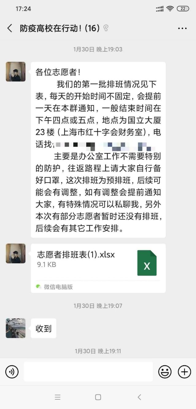来自国际商务外语学院的沈圆同学在春节期间积极响应团组织号召报名参加了防疫志愿者工作,服务于浦东新区康桥镇汤巷馨村居委。线上进行防疫宣传工作的同时和居委一起上门逐户摸排,为隔离居民采购配送所需物资。巧合的是,庚子年春节至今,沈圆的母亲和爷爷也通过不同的渠道参与疫情防控的志愿服务,分别在居委登记口罩预约发放和在道口对外来车辆进行劝返,全家齐上阵,用志愿服务为疫情防控添砖加瓦,打响这场青春战“疫”。