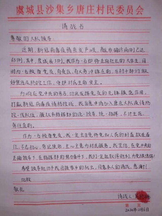 来自会计学院的吴杨梅同学,寒假期间得知家乡河南省商丘市虞城县出现了3例新冠病毒感染的肺炎病例后,主动向村大队书记请缨,希望自己能加入到疫情防控指挥部,加入到疫情防控一线队伍,尽一名党员的绵薄之力。在按着红手印的请战书中,她写道“作为一名预备党员,我一定会自觉将党和人民的利益放在首位,不忘初心、牢记使命,全心全意为村民服务。希望能给予我回报家乡的机会,同意本人的请战!”